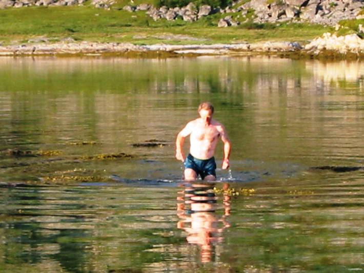 Nigel, Type-A maniac, goes for an arctic swim …