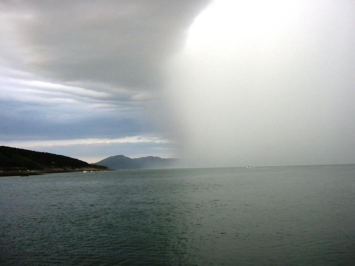 A spectacular rain storm sweeps down the fjord